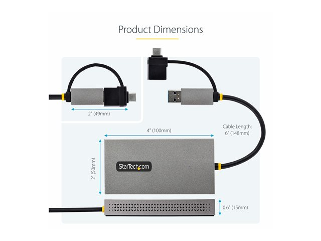 StarTech.com USB to Dual HDMI Adapter, USB A/C to 2x HDMI Monitors (1x 4K 30Hz, 1x 1080p), Integrated USB-A to C Dongle, 4in/11cm Cable, Windows & macOS - USB 3.0 to HDMI Multi-Monitor Display Adapter for Laptop (107B-USB-HDMI) - Videokort - USB typ A, USB-C hane till 2 x 19 pin HDMI Type A hona - grå - stöd för 4K
