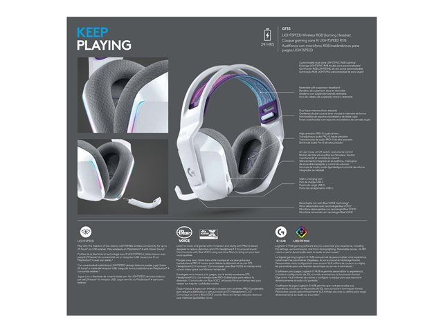 | Egenskaper | LIGHTSYNC RGB, Pro-G-enheter, Blue VO!CE Mic Technology, LIGHTSPEED trådlös teknik |