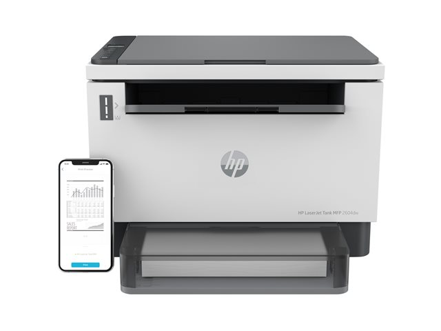 Upptäck företagsanpassade funktioner och besparingar med HP LaserJet Tank MFP 2604dw allt-i-ett-skrivare som levereras förfylld med HP-originaltoner för upp till 5000 sidor.