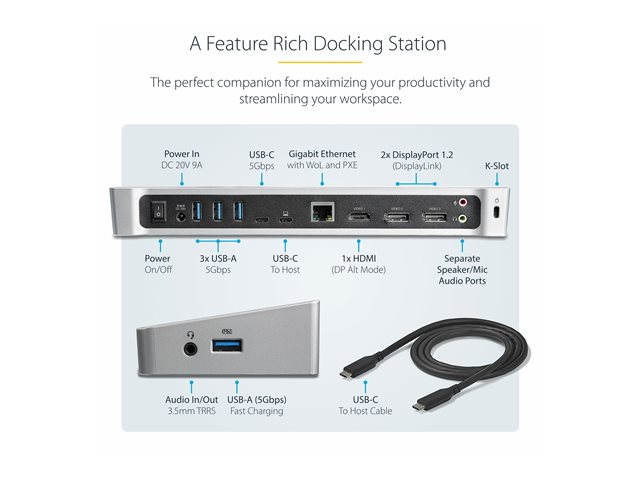 StarTech.com 4K USB-C-docka för tre skärmar med 5 USB 3.0-portar - 100W PD - Dockningsstation - USB-C - HDMI, DP - 1GbE - 100 Watt - TAA-kompatibel